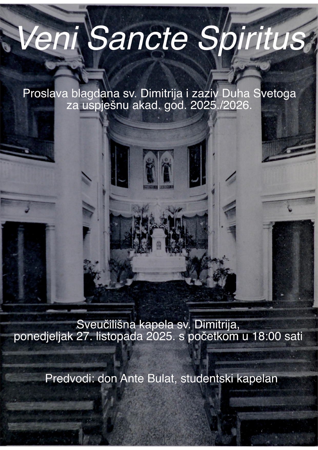 Sveta misa biti će u ponedjeljak 27. listopada 2025. s početkom u 18:00 sati u sveučilišnoj kapeli sv. Dimitrija. Predvodi don Ante Bulat, novi studentski kapelan, a